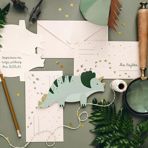 - Uitnodigingen in de vorm van een Triceratops in groen met kleurrijke print